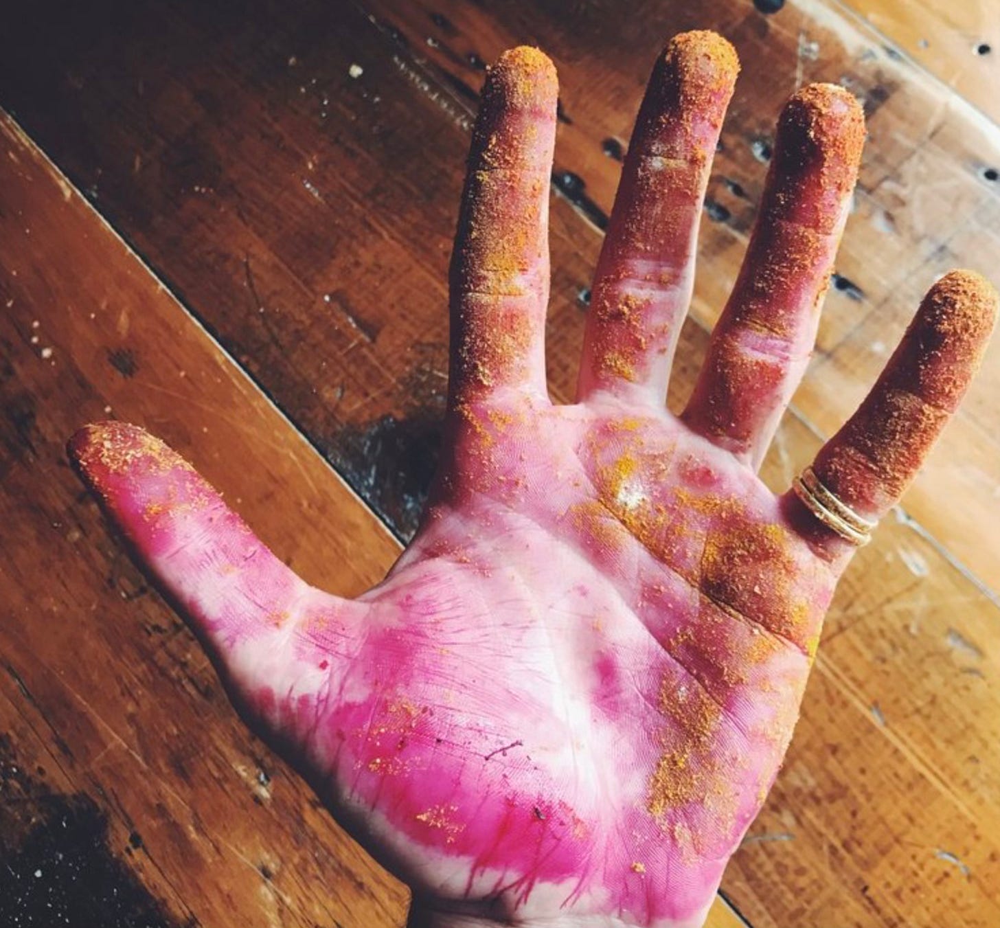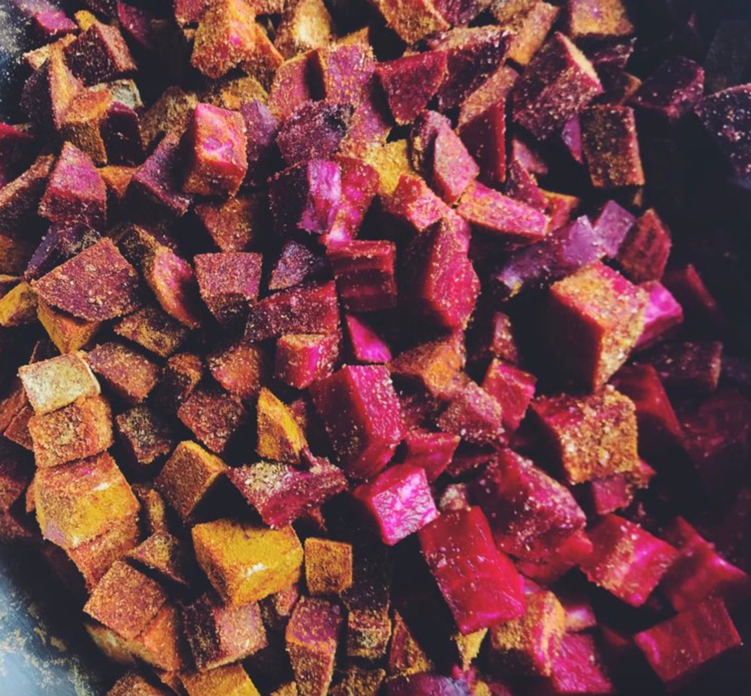 Mix chopped beetroot, turmeric, curry powder, ground coriander, fenugreek powder and salt in a big bowl and massage the beetroot with your hands, love and attention.